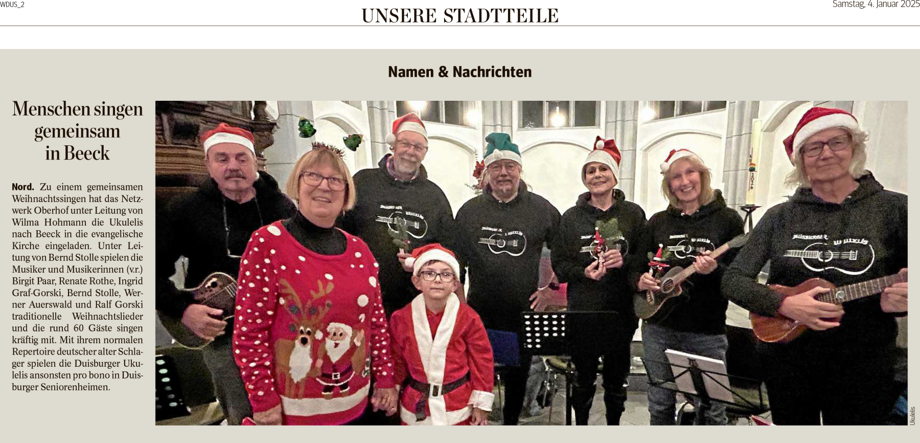 Mit unserer Aktion „Ukulelegruppe spielt in Seniorenheimen“ unterstützen wir die WDR 2 Aktion, indem wir bei unseren Konzerten um Spenden, hauptsächlich bei der Leitung und Besuchern, nicht bei den Bewohnern, für das WDR 2 Weihnachtswunder 2025 bitten.